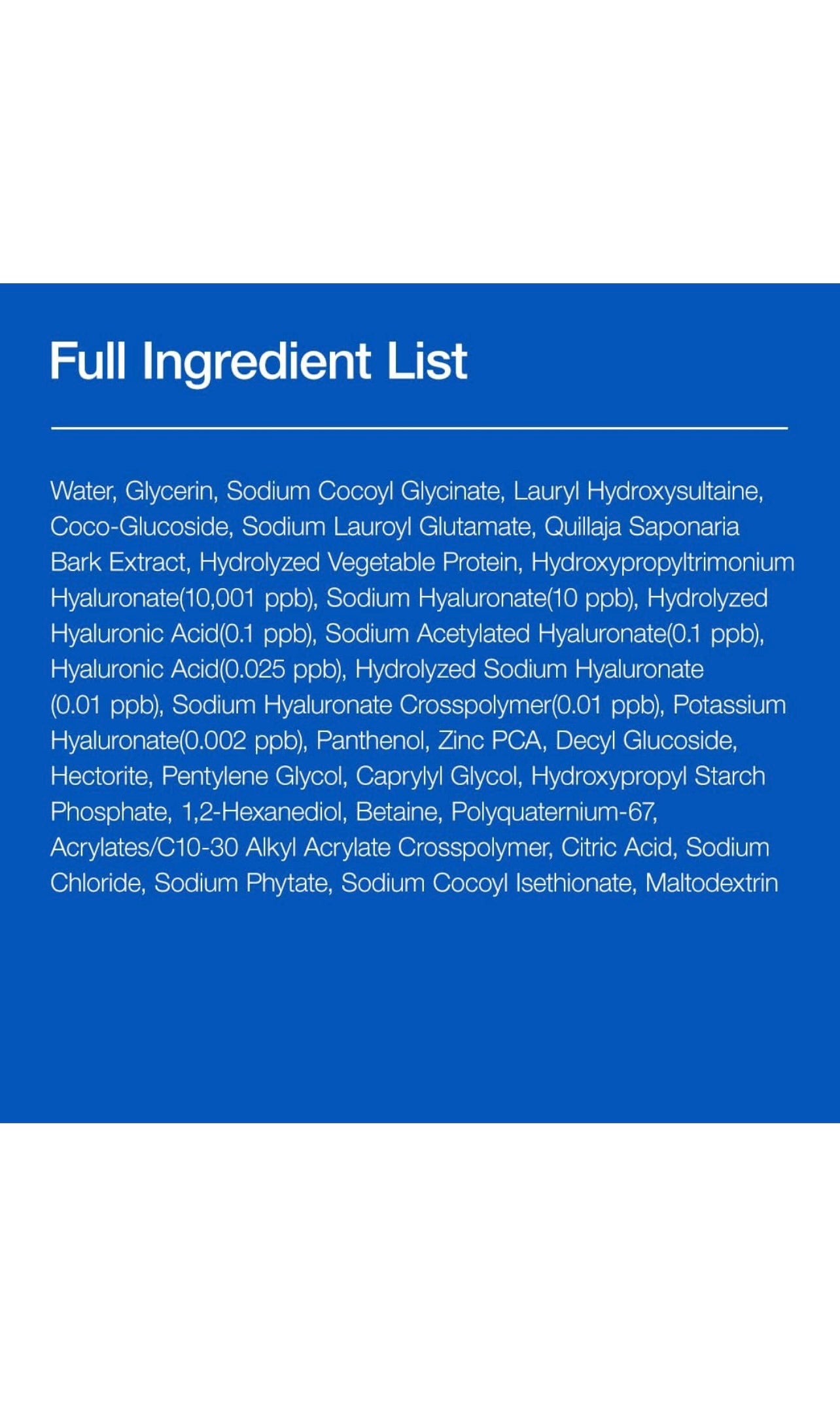 Water, Glycerin, Sodium Cocoyl Glycinate, Lauryl Hydroxysultaine, Coco-Glucoside, Sodium Lauroyl Glutamate, Quillaja Saponaria Bark Extract, Hydrolyzed Vegetable Protein, Hydroxypropyltrimonium Hyaluronate, Sodium Hyaluronate, Hydrolyzed Hyaluronic Acid, Sodium Acetylated Hyaluronate, Hyaluronic Acid, Hydrolyzed Sodium Hyaluronate, Sodium Hyaluronate Crosspolymer, Potassium Hyaluronate, Panthenol, Zinc PCA, Decyl Glucoside, Hectorite, Pentylene Glycol, Caprylyl Glycol, Hydroxypropyl Starch Phosphate, 1,2-Hexanediol, Betaine, Polyquaternium-67, Acrylates/C10-30 Alkyl Acrylate Crosspolymer, Citric Acid, Sodium Chloride, Sodium Phytate, Sodium Cocoyl Isethionate, Maltodextrin