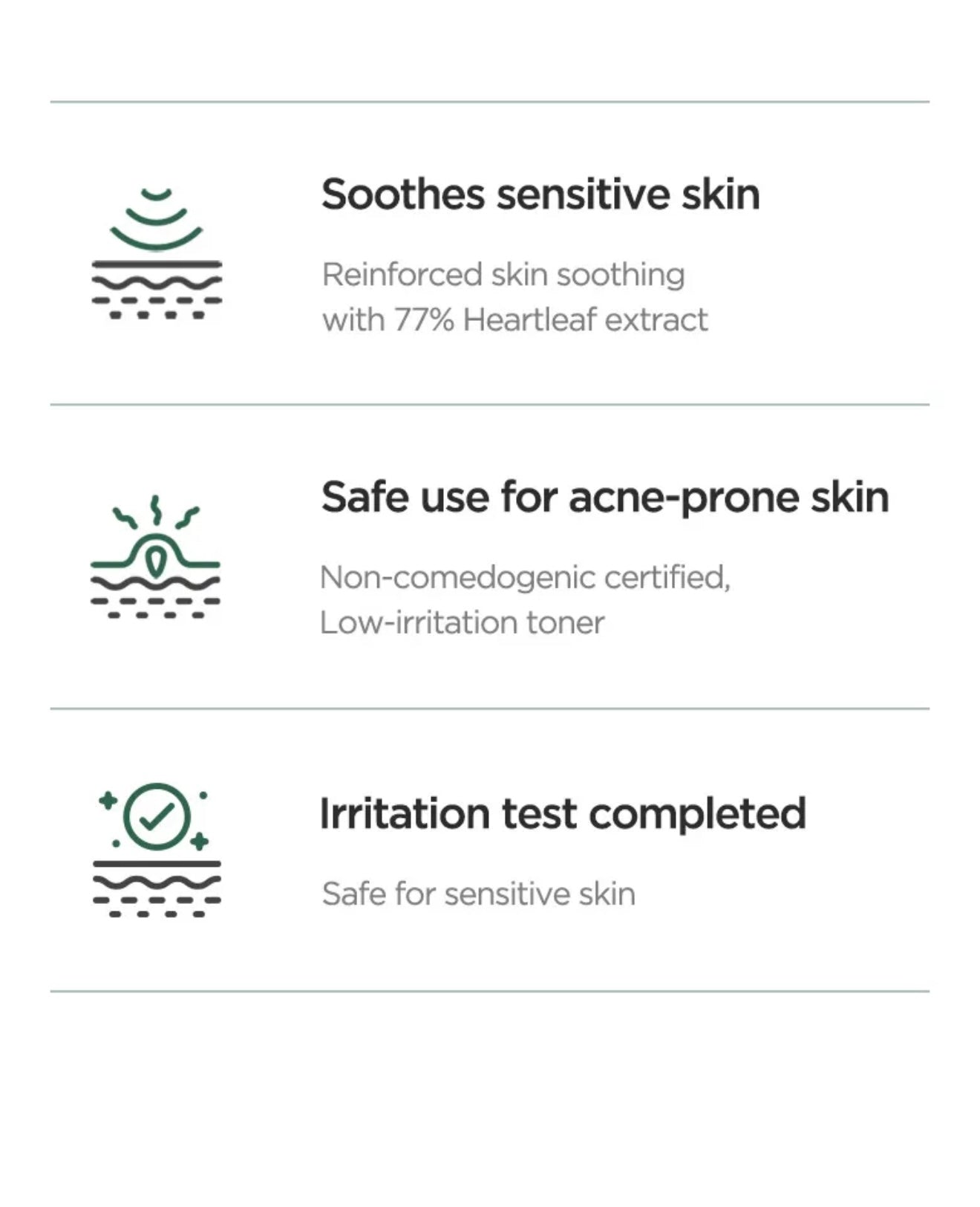 - Soothing: Calms irritation and reduces redness with Heartleaf Extract.