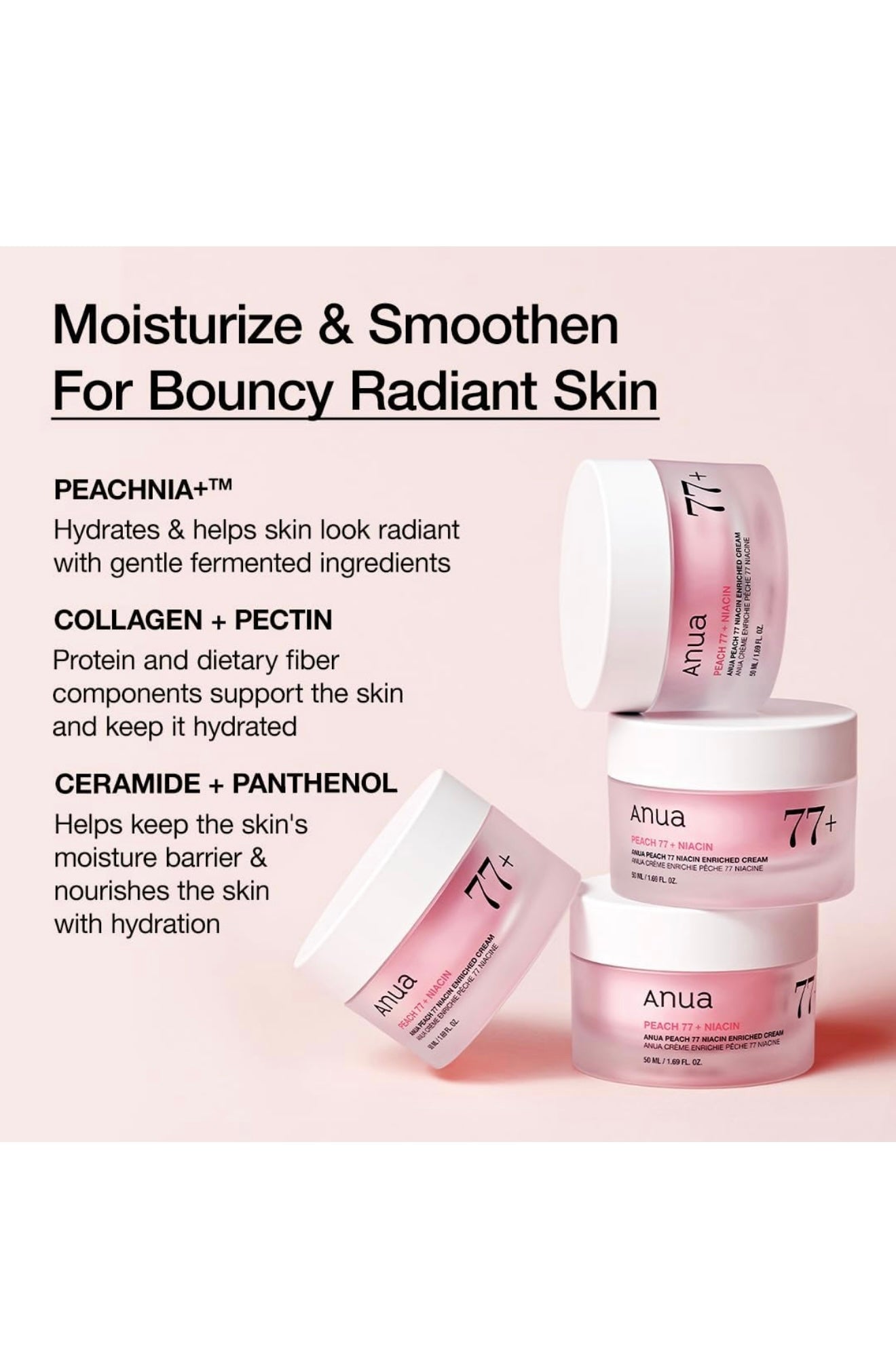 Nourish and revitalize your skin with Anua - Peach 77 Niacin Enriched Cream. Formulated with 77% Peach Fruit Extract, Ceramide, Collagen, Panthenol, and Protein, this moisturizing cream restores a smooth, dewy complexion while hydrating dry skin. The quick-absorbing, non-sticky pudding gel texture makes it perfect for all skin types. Dermatologist-tested for non-irritation.