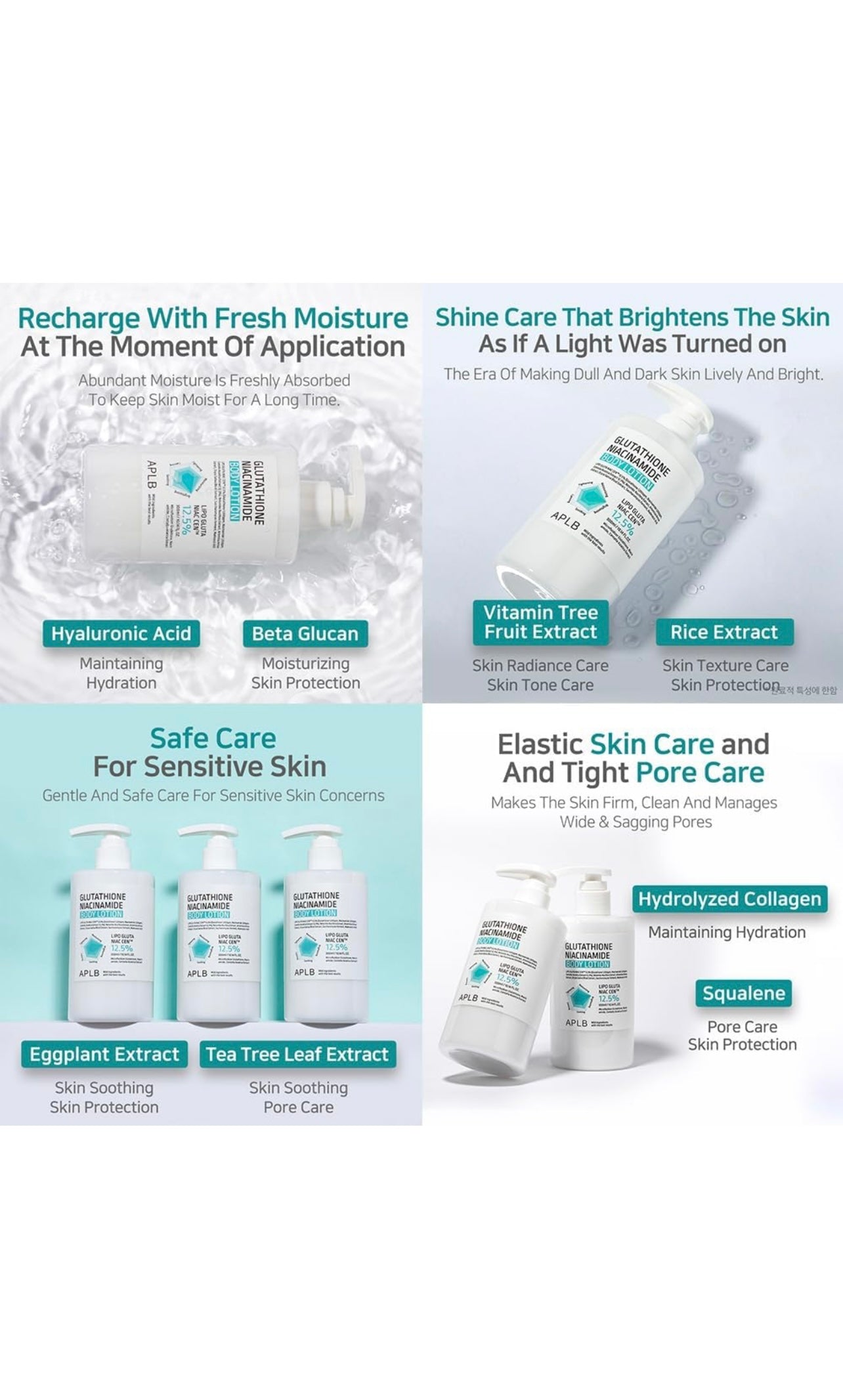The APLB Glutathione Niacinamide Body Lotion is a lightweight, vegan, and cruelty-free body lotion designed to deeply hydrate and repair irritated skin. Enriched with Glutathione, Niacinamide, and Centella Asiatica, it helps to brighten the skin, reduce redness, and increase elasticity. The formula is free from harsh alcohols, common allergens, oils, parabens, and sulfates, making it suitable for sensitive skin. It absorbs quickly, leaving a smooth, non-sticky finish, and is perfect for daily use to achieve a radiant and healthy complexion