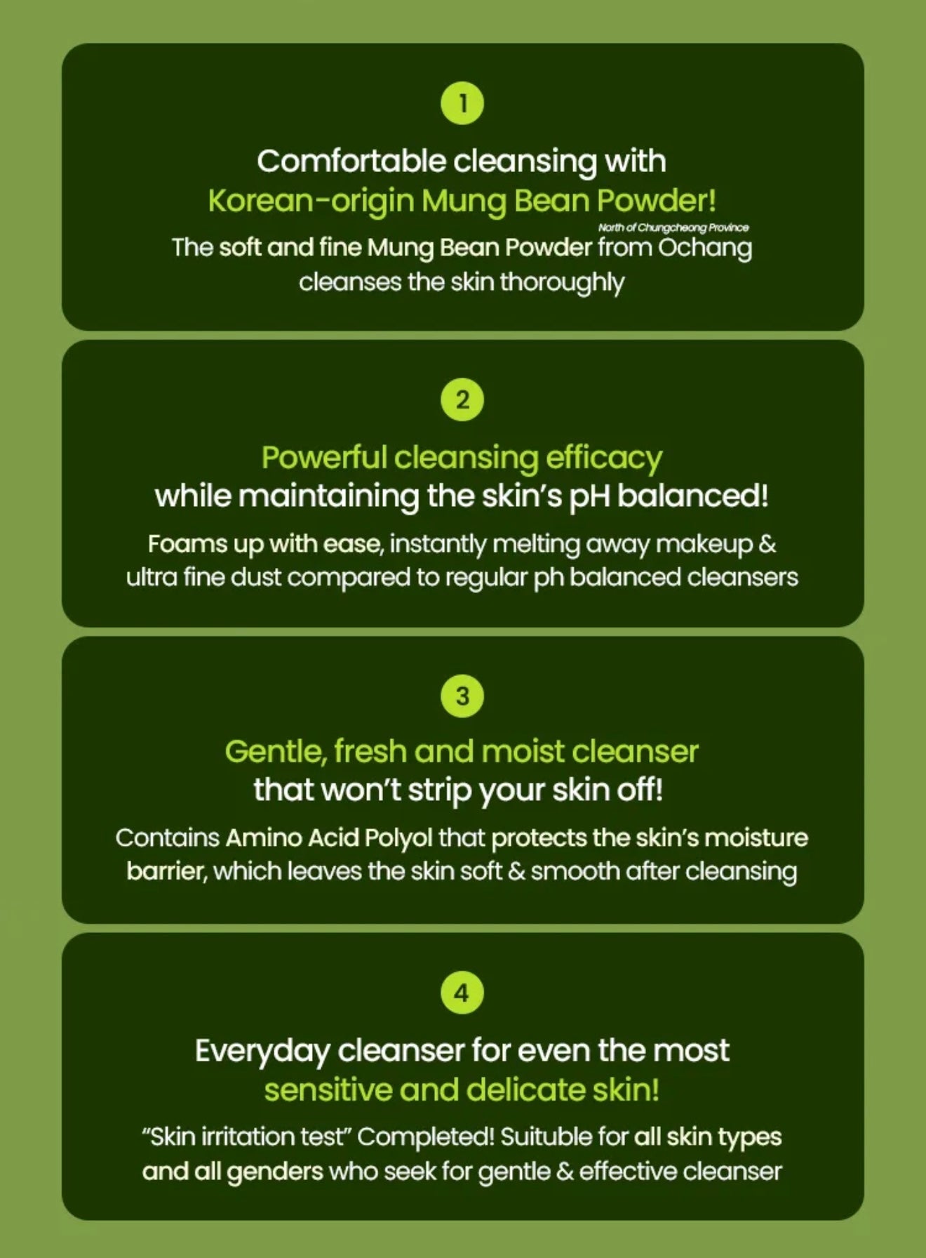 - Mung bean extract helps soothe and clarify