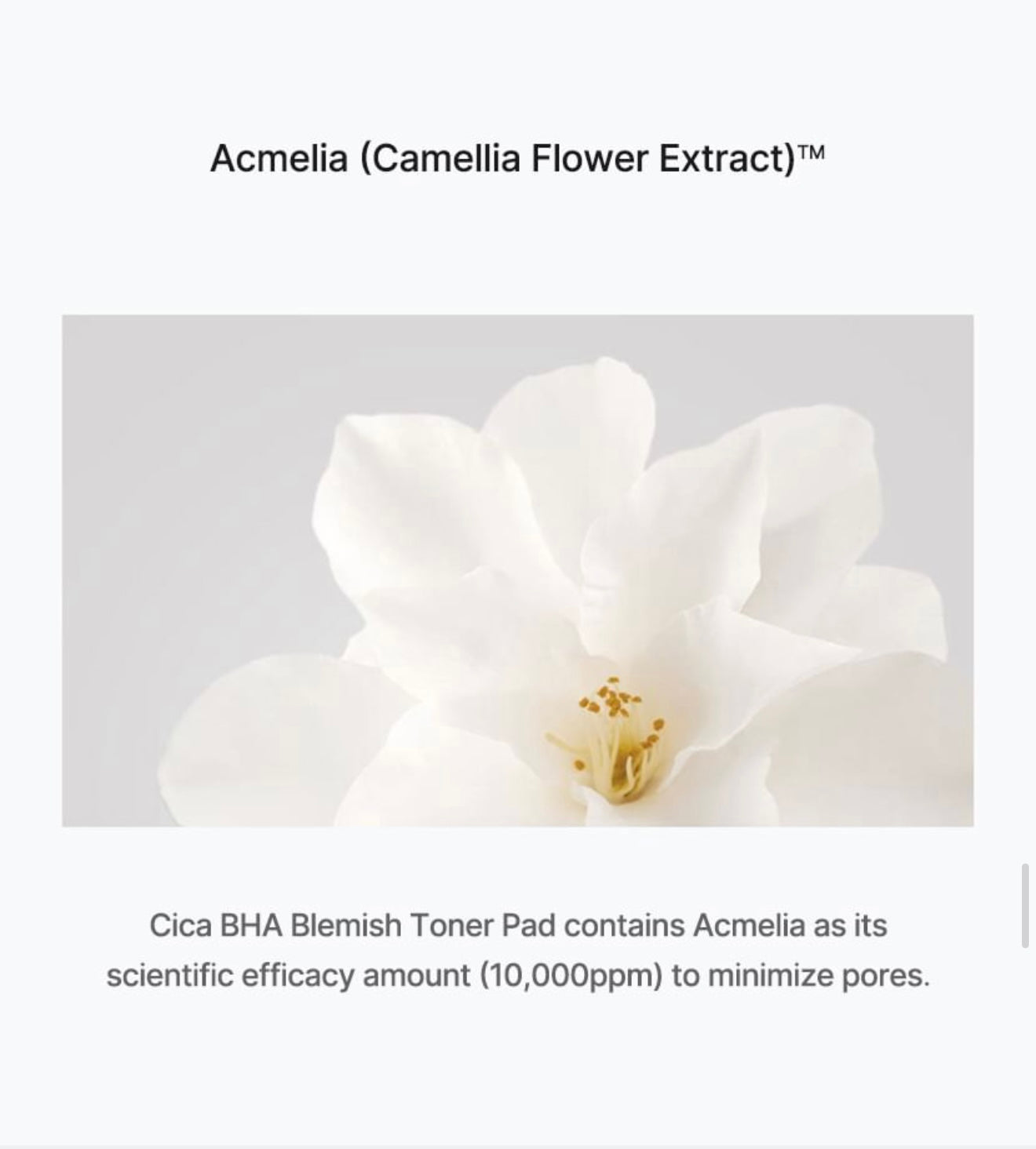 Water, Butylene Glycol, Alcohol Denat., Camellia Japonica Flower Extract, 1,2-Hexanediol, Arginine, Salicylic Acid, Hydroxyacetophenone, C12-14 Pareth-12, Lactobionic Acid, Ethylhexylglycerin, Glycerin, Bifida Ferment Lysate, Centella Asiatica Extract, Disodium EDTA, Lactose, Melaleuca Alternifolia (Tea Tree) Leaf Oil, Houttuynia Cordata Extract, Portulaca Oleracea Extract, Perilla Ocymoides Seed Extract, Panthenol, Lonicera Caprifolium (Honeysuckle) Extract, Pelargonium Graveolens Extract, Uncaria Tomentosa Extract, Agrimonia Eupatoria Extract, Corydalis Turtschaninovii Root Extract, Cupressus Sempervirens Leaf Extract, Nepeta Cataria Extract, Madecassoside, Capryloyl Salicylic Acid