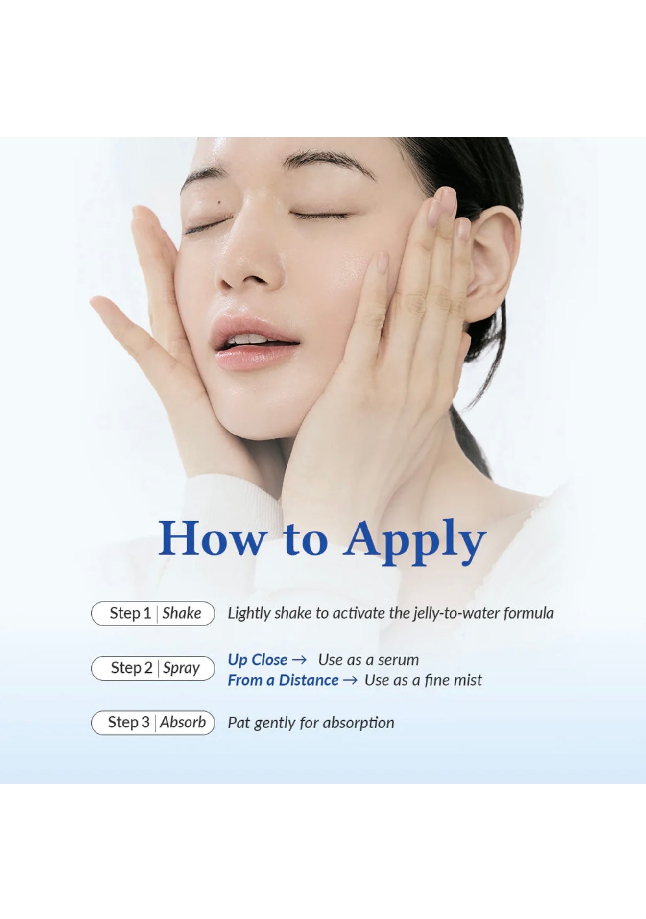 Hold the bottle about 20–30 cm from your face and spray evenly over the face anytime your skin needs hydration. Use after cleansing, before makeup, or throughout the day.