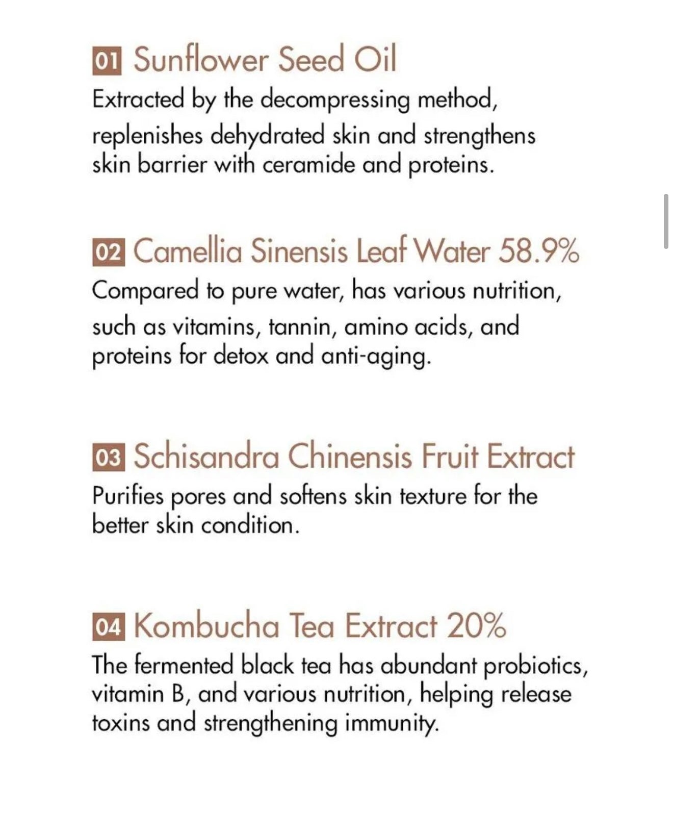 [Vegan Kombucha Tea Essence] Water, Triethylhexanoin, Hydrogenated Poly(C6-14 Olefin), 1,2-Hexanediol, Methylpropanediol, Butylene Glycol, Glycerin, Trilaureth-4 Phosphate, Camellia Sinensis Leaf Extract, Saccharomyces Ferment Filtrate, Camellia Sinensis Leaf Water, Helianthus Annuus (Sunflower) Seed Oil Unsaponifiables, Polyquaternium-51, Sodium Hyaluronate, Ethylhexylglycerin, Hydrogenated Lecithin, Dextrin, Theobroma Cacao (Cocoa) Seed Extract, Centella Asiatica Extract, Ficus Carica (Fig) Fruit Extract, Schisandra Chinensis Fruit Extract, Amaranthus Caudatus Seed Extract, Ulmus Davidiana Root Extract, Ceramide NP