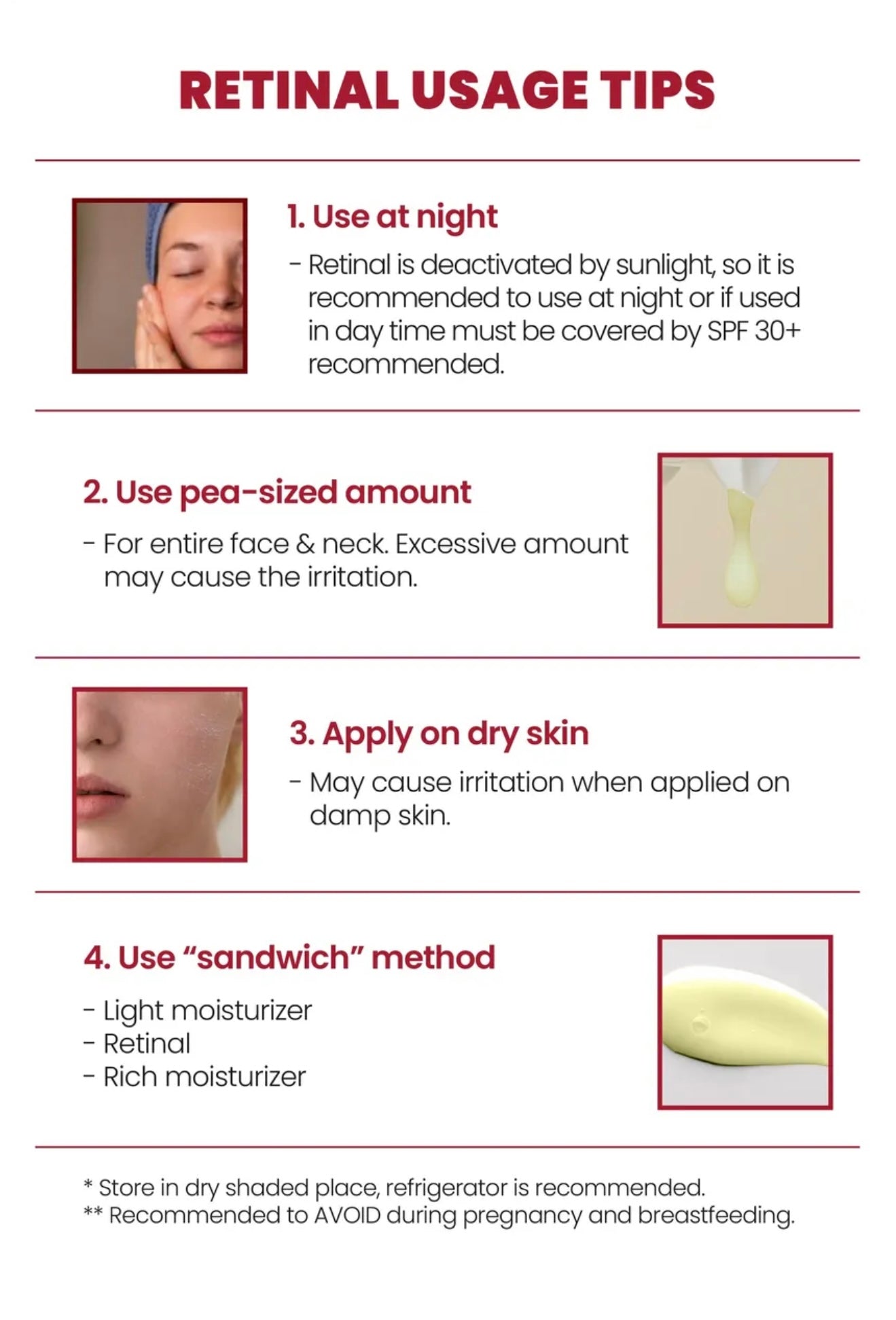 - (Nighttime skincare routine) After cleansing and toning, apply a pea-sized amount on skin.