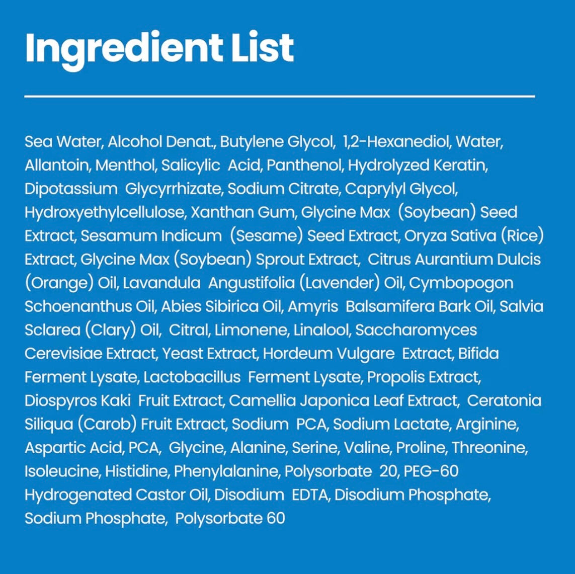 Sea Water, Alcohol Denat., Butylene Glycol, 1,2-Hexanediol, Water, Allantoin, Menthol, Salicylic Acid, Panthenol, Hydrolyzed Keratin, Dipotassium Glycyrrhizate, Sodium Citrate, Caprylyl Glycol, Hydroxyethylcellulose, Xanthan Gum, Glycine Max (Soybean) Seed Extract, Sesamum Indicum (Sesame) Seed Extract, Oryza Sativa (Rice) Extract, Glycine Max (Soybean) Sprout Extract, Citrus Aurantium Dulcis (Orange) Oil, Lavandula Angustifolia (Lavender) Oil, Cymbopogon Schoenanthus Oil, Abies Sibirica Oil, Amyris Balsamifera Bark Oil, Salvia Sclarea (Clary) Oil, Citral, Limonene, Linalool, Saccharomyces Cerevisiae Extract, Yeast Extract, Hordeum Vulgare Extract, Bifida Ferment Lysate, Lactobacillus Ferment Lysate, Propolis Extract, Diospyros Kaki Fruit Extract, Camellia Japonica Leaf Extract, Ceratonia Siliqua (Carob) Fruit Extract, Sodium Pca, Sodium Lactate, Arginine, Aspartic Acid, Pca, Glycine, Alanine, Serine, Valine, Proline, Threonine, Isoleucine, Histidine, Phenylalanine, Polysorbate 20, Peg-60 Hydrogenated Castor Oil, Disodium Edta, Disodium Phosphate, Sodium Phosphate, Polysorbate 60