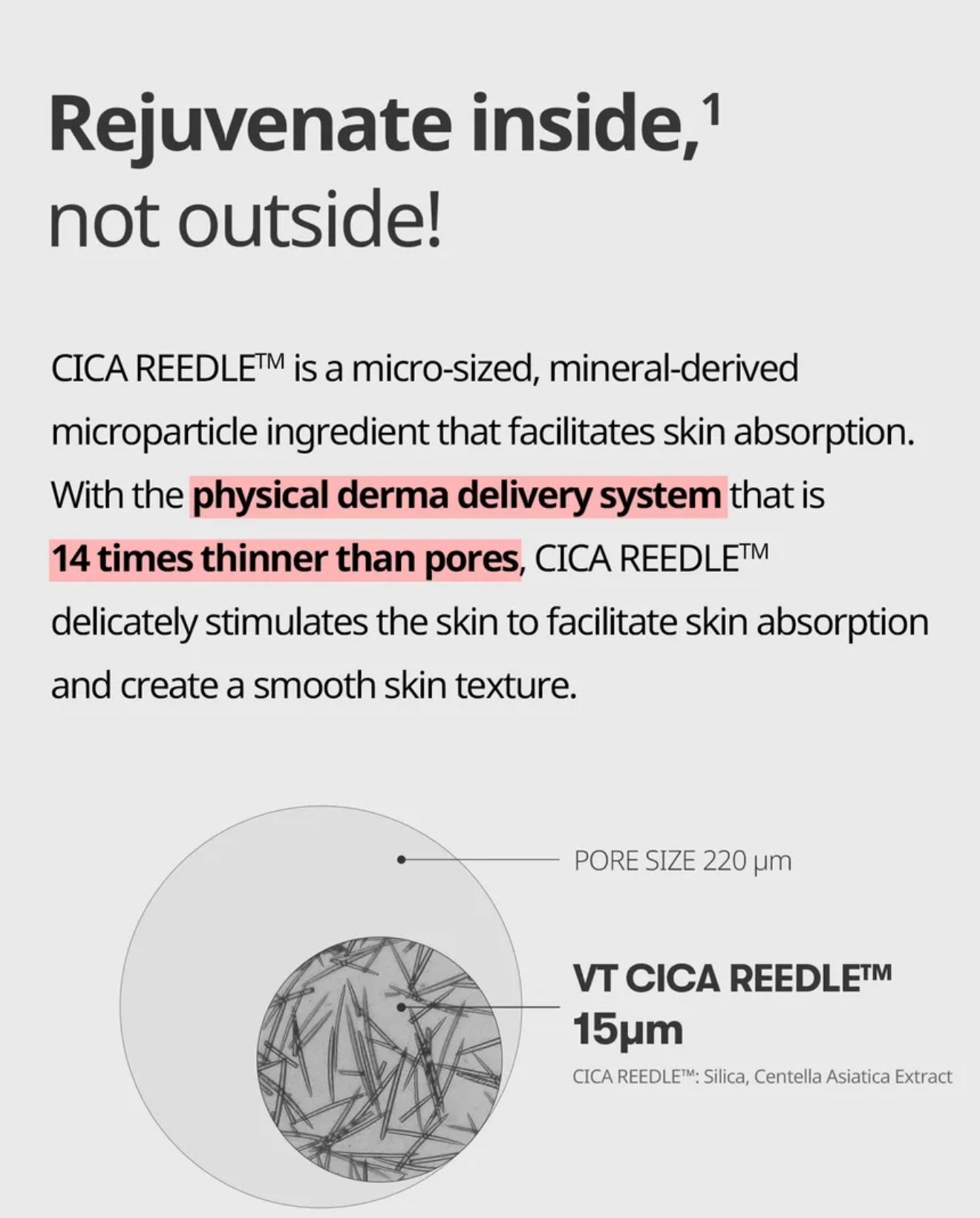 - The delicate design of the micro-sized Cica Reedle facilitates skin absorption and awakens the skin condition to restore healthy skin.